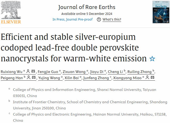 这一研究成果以“Efficient and stable silver-europium codoped lead-free double perovskite nanocrystals for warm-white emission”为题,发表在国产SCI一区《Journal of Rare Earths》期刊上,影响因子IF是5.2。这是发光光谱团队继揭示近红外发光的钠铒双钙钛矿纳米晶超快动力学机理[Laser & Photonics Reviews, 2021, 15, 2100218]后,在双钙钛矿纳米晶中探究发光超快动力学机理的又一突破工作。黄色漫画 吴瑞祥副教授为论文第一作者,与苗向阳教授、山东大学韩沛耿研究员为通讯作者,2022级硕士研究生郭峰杰在本研究中LED制备方面做出贡献。该工作得到了国家自然科学基金、山西省基础研究计划和山东省自然科学基金等项目资助。