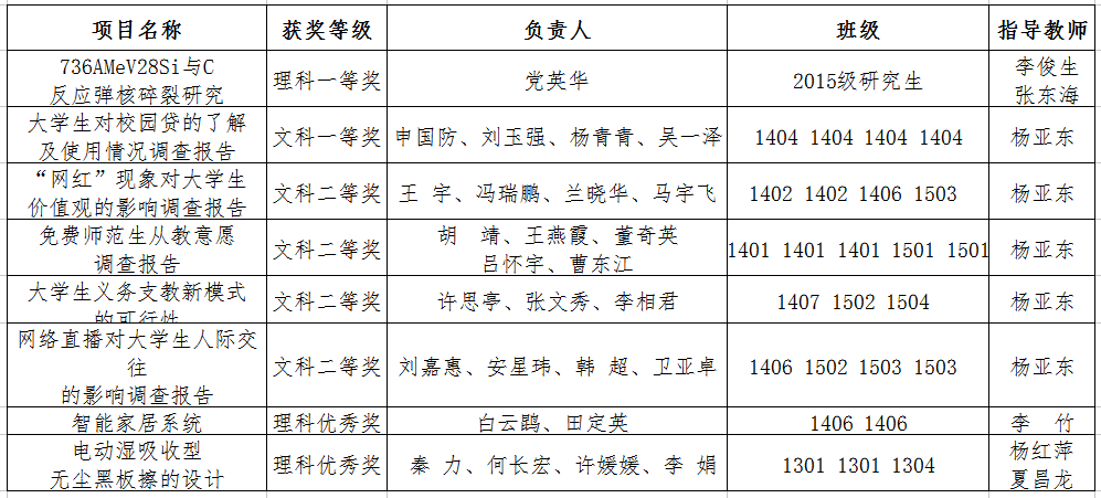 理科组中,党英华同学对736AMeV28Si与C反应核弹碎裂进行了深入研究,在李俊生、张东海两位老师的耐心指导下,最终研究成功并做了详细、科学的报告。在比赛现场,党英华同学以其渊博的知识储备,科学的实验研究,新颖的研究主题脱颖而出,赢得评委老师的一致好评,最终荣获一等奖。