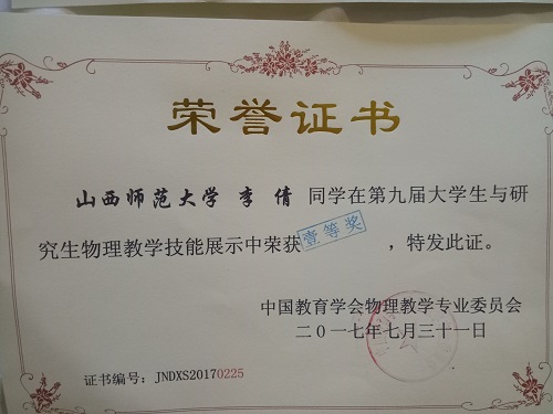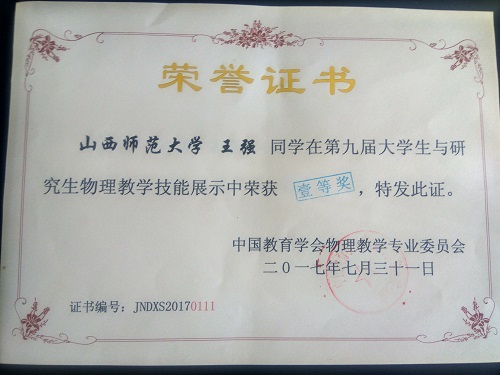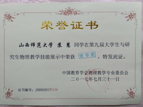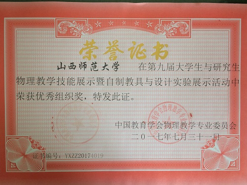 据悉,全国大学生与研究生物理教学技能展评暨自制教具与设计实验展评由中国教育学会物理专业委员会主办,每年一届,迄今已举办九届。大赛旨在促进高等院校物理教育专业大学生与研究生的物理教学技能的培养与发展。大赛既是师范类物理学专业大学生交流教学技能、相互学习提高的舞台,又是高校推进教学质量工程建设、提高人才培养质量的盛会,对于创新人才培养模式、提高学生的实践能力和综合素质大有裨益。