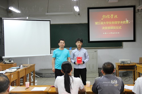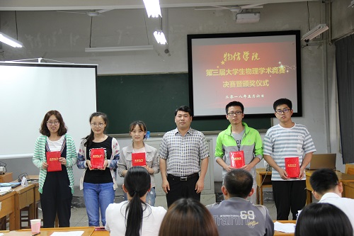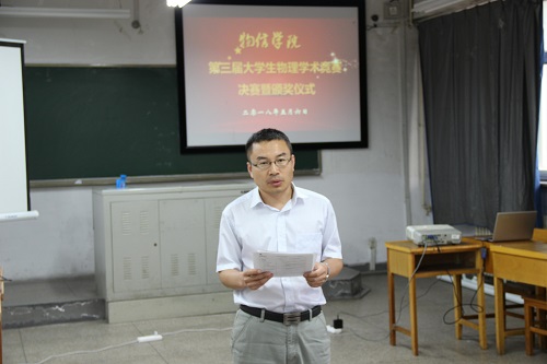 在07219教室举办了第三届大学生物理学术竞赛决赛暨颁奖仪式,院长张进军、院党委副书记陈向波、副院长侯俊华出席颁奖仪式并为获奖集体和个人颁发了荣誉证书,颁奖仪式由物理实验室主任李俊生主持。