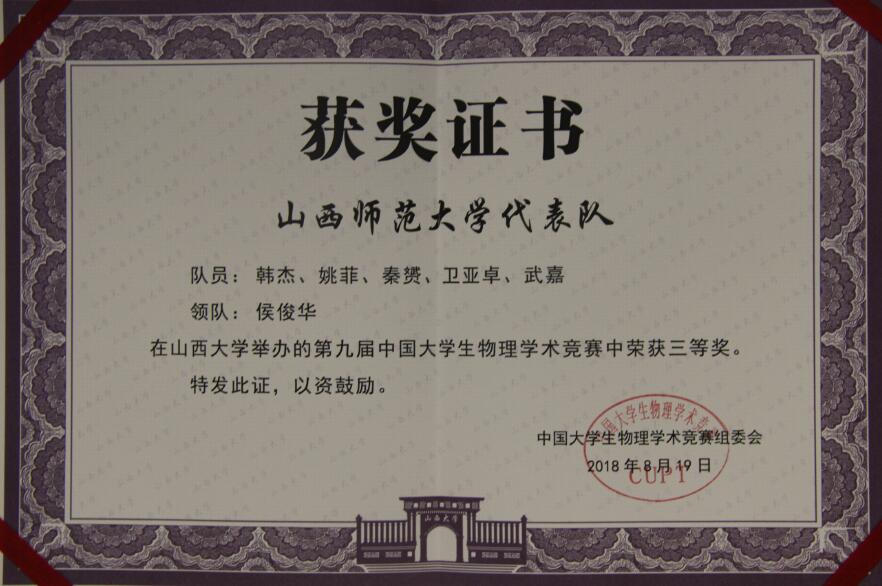 2018年8月15日-19日,由中国大学生物理学术竞赛(CUPT)组织委员会主办的第九届中国大学生物理学术竞赛在山西大学举行,共有来自全国62所参赛高校和6支观摩高校的700多名师生参加了本次赛事。黄色漫画 派出了由副院长侯俊华教授担任领队,由程留永博士、苏晓强博士任指导教师,由韩杰、武嘉、卫亚卓、秦赟、姚菲5名同学组成的参赛代表队。经过3天紧张激烈的比赛,在与众多“985”高校的比拼中,黄色漫画 选手沉着冷静、表现出色,最终获得第九届中国大学生物理学术竞赛团体三等奖。