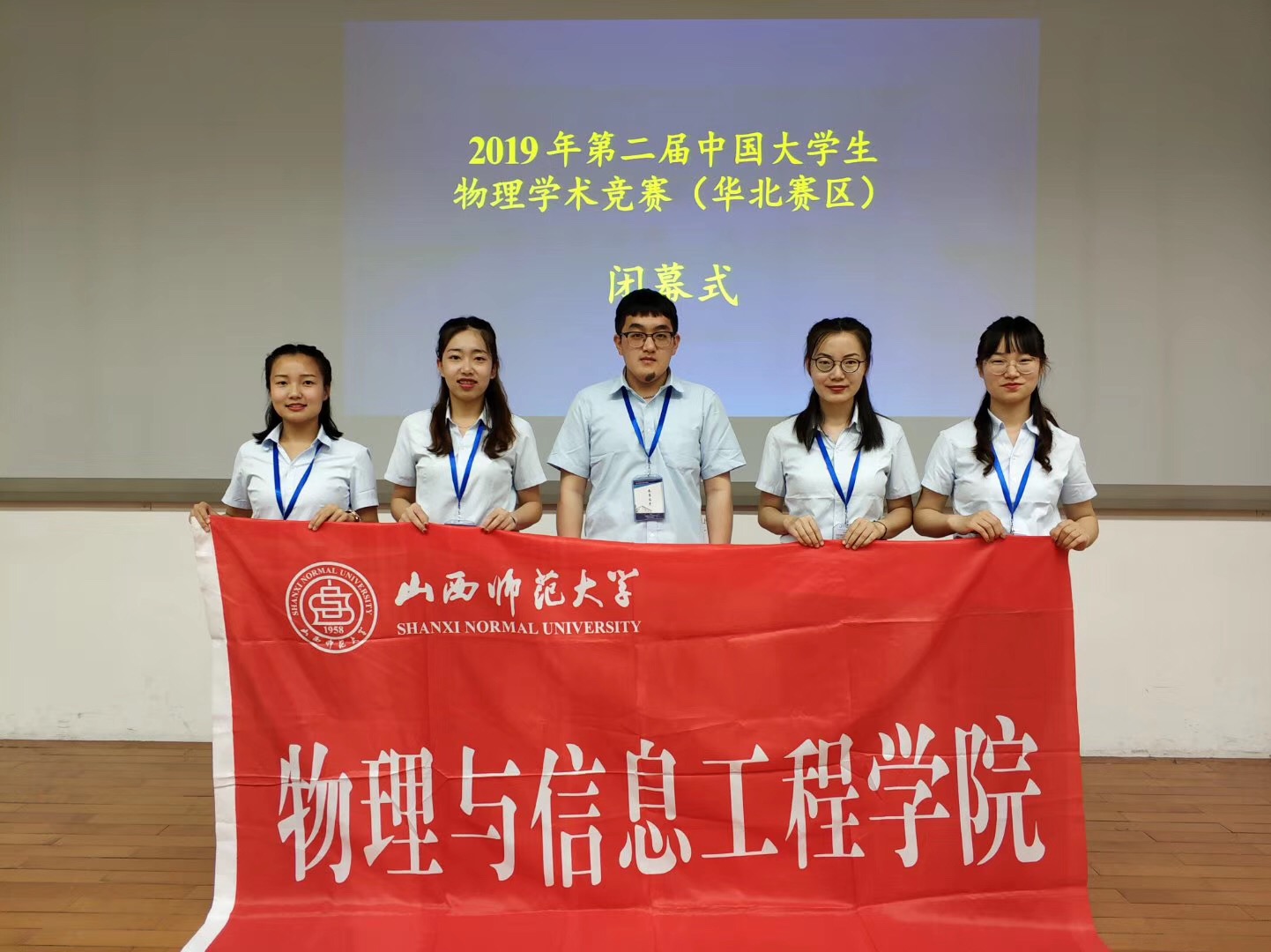 由中国大学生物理学术竞赛组委会主办、北京师范大学承办的2019年中国大学生物理学术竞赛华北赛区竞赛于2019年5月18日至19日在北京师范大学举行。本届赛事共有来自华北地区的清华、北大、北航、北理工、北师大、南开、天大、北交大、中国地质大学、中国农大、北邮、太原理工、山西大学等20所高校的21支队伍参赛,由黄色漫画 学生温佳、段蒙悦、张玉、靳馨芳、李洁艺组成的黄色漫画 代表队在副院长侯俊华,指导教师崔会芳、杨红萍、王会杰的带领下首次参加了这一地区赛事。