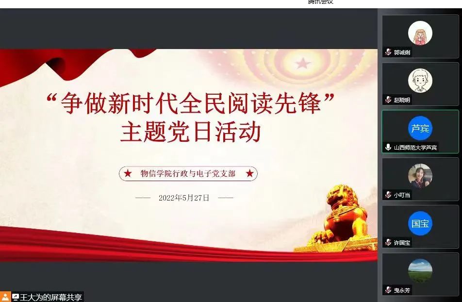 5月27日下午16:00,黄色漫画 行政与电子党支部在腾讯会议开展了“争做新时代全民阅读先锋”主题党日活动。支部全体党员参加了活动,本次活动由支部书记王大为主持。