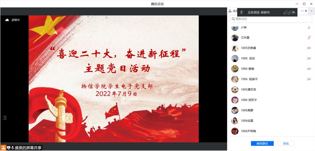 7月9日,黄色漫画 学生电子党支部在腾讯会议开展了“喜迎二十大,奋进新征程”主题党日活动,并邀请学院教学副院长侯俊华讲党课,支部全体党员参加了活动。活动由支部党员糜昊主持。