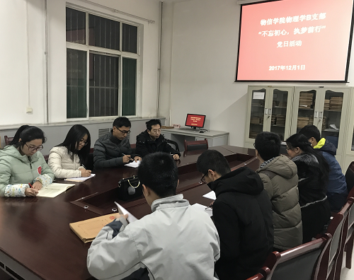 2017年12月1日晚7点,物信学院物理学B支部在04106会议室召开“不忘初心,执梦前行”党日活动。会议由支部书记徐小虎主持。