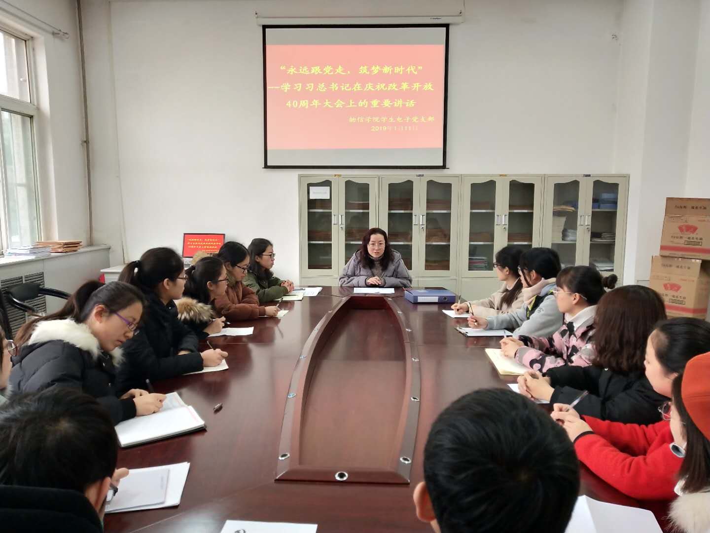2019年1月11日中午11:20,院党委副书记王玮为黄色漫画 学生电子党支部在四号楼一层会议室作了“‘永远跟党走,筑梦新时代’——学习习近平总书记在改革开放四十周年大会上的重要讲话”主题党课。全体在校党员共计27人聆听了此次党课。