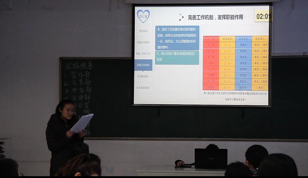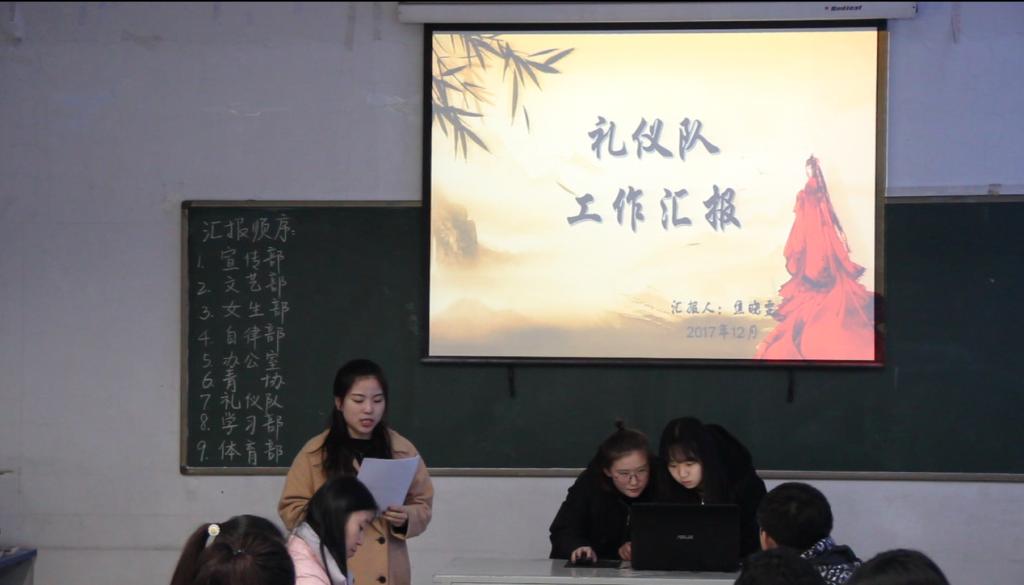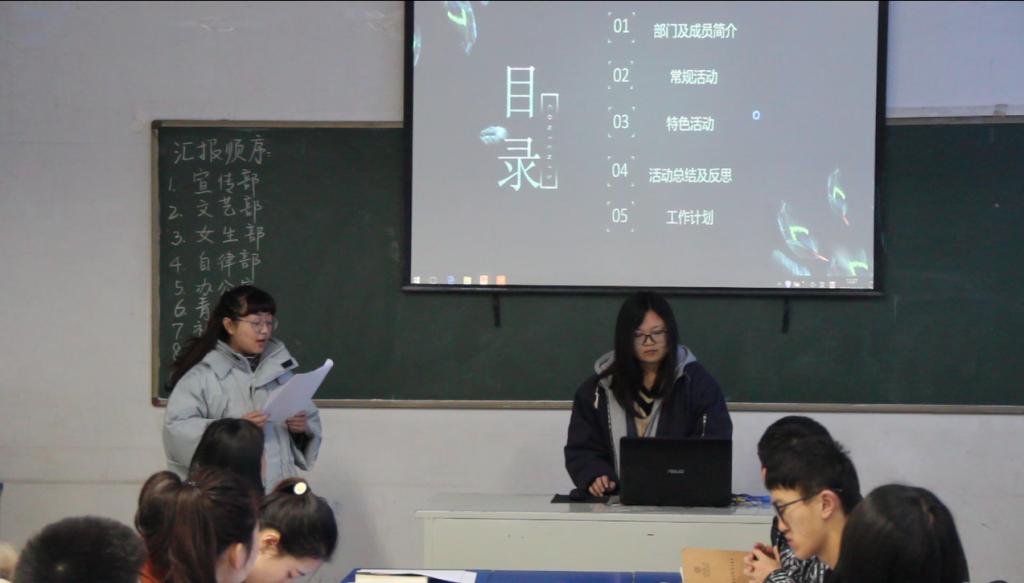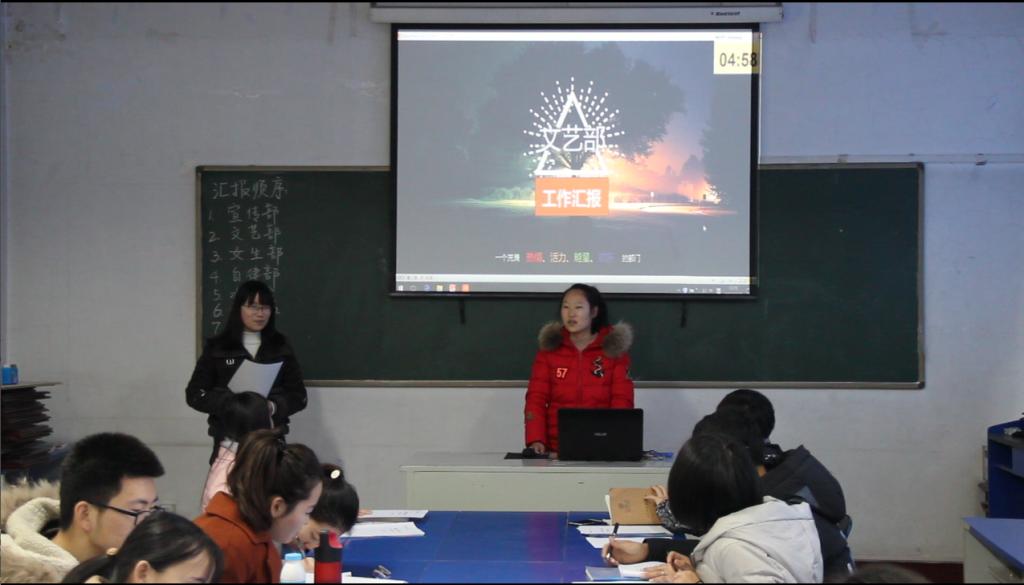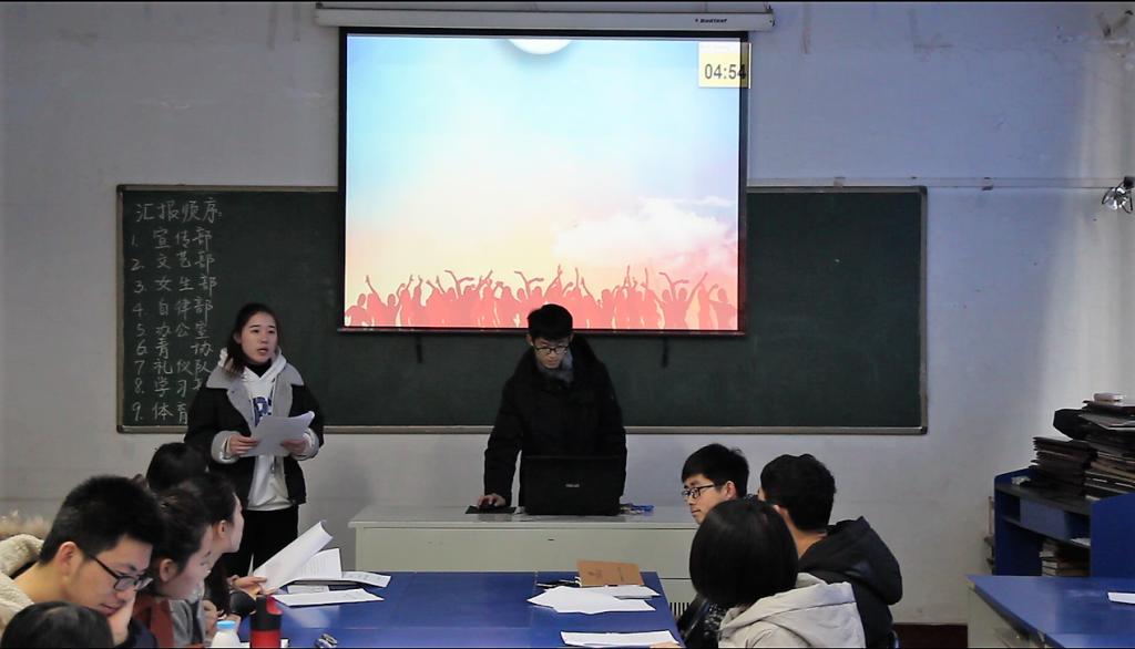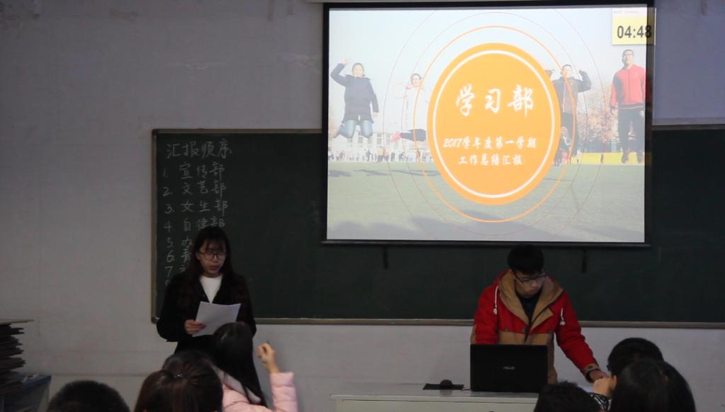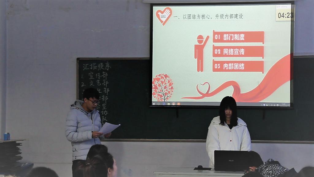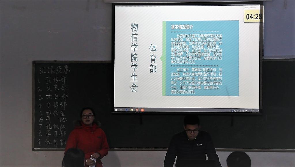 学生会主席韩超介绍工作汇报要点后,学生会九个部门部长轮流发言。每一位代表以PPT的形式向大家展示了举办的活动和取得成绩。一学期的辛苦努力汇集呈现, 大家真切地明白,一分耕耘一分收获,观众不时以热烈的掌声肯定他们辛勤的付出和汗水。各部部长在展示成绩后,也介绍了下学期的计划和目标,力争是更上一层楼。