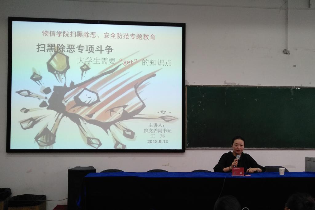 为深入贯彻党中央关于开展扫黑除恶专项斗争的工作要求,增强黄色漫画 学生扫黑除恶专项斗争的责任感和使命感,2018年9月13日上午8:50,黄色漫画 在05203教室举办了扫黑除恶、安全防范专题讲座。专题讲座由院党委副书记王玮主讲,大一全体新生参加。