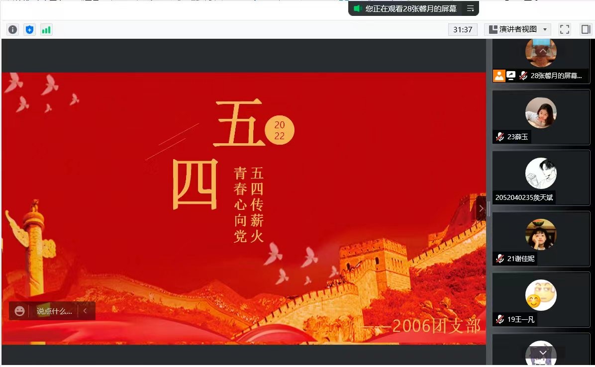 活动中,团支书李雅婷带领支部全体成员重温了入团誓词,激起大家作为共青团员身上所被赋予的时代责任感。随后,大家一起观看了莫言写给青年朋友的一封信——《不被大风吹倒》,学习了莫言先生直面狂风不妥协不逃避的精神,做一个不惧生活波折、逆风而上的搏击者。在“给先辈的一封信”环节中,同学们积极分享,用文字记录自己对先辈崇高的敬意,表达自己对于先辈们的深切缅怀以及对“五四精神”的深刻理解。
