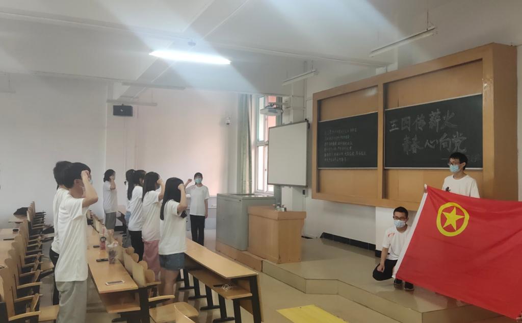 本次团日活动由线上线下两部分组成。线上会议中,团支书郭龙女带领同学们学习了习近平总书记在中国人民大学考察时的重要讲话,同学们纷纷表示会在学习生活中不断求索,用奋斗铸就青春底色。线下活动中,支部成员分为小组,齐心协力跑出一个五角星的形状,以此迎接五四青年节的到来。最后,同学们面向团旗,在杨旭敏同学的带领下,重温入团誓词。