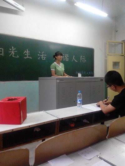 本次比赛有幸请到了2014年“我的中国梦”学校演讲比赛二等奖获得者王秋波,普通话艺术社团名誉团长杨晓强,莳英计划三期学员及“弘扬中华传统文化”演讲比赛第一名获得者杨红担任评委。本次比赛旨在提高大学生心理水平,培养学生积极向上的健康心态,彰显大学生的活力。参赛选手来自不同的班级,每个选手在演讲过程中都展现了自己独特的个人魅力。王燕霞同学声音洪亮,在演讲过程中落落大方,赢得了大家的一致好评;陈春娟同学凭借自己贴近生活的事例,幽默风趣的表达,以及大方得体的举止获得了本次比赛的一等奖。评委们专业犀利的点评,耐心认真的指导更是将本次比赛推向了高潮 。