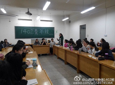 1403班于3月24日开展了以“实现人生价值”为主题的班会。班会过程中,同学们观看了“2015感动中国十大人物”颁奖视频,之后,班内同学分组讨论观后感并选择代表进行了发言。此次观影学习使同学们深受感动与鼓舞,传递了正能量,收到了良好的教育效果。