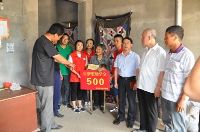 在柏坡底村,大家分别来到车城乡小学学生刘志勇、曹惠念和韩俊芳的家中探望,并给每位学生发放了500元的梦想助学金,分别交到了其家长王秀英、陈曹有和韩明春的手上。随后到达桃村看望程刚文和曹建文,并把车城乡小学学生程宁和吉县三中学生曹晓静的助学金交到了家长手上。