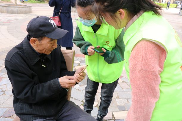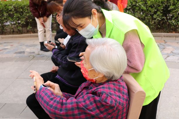 活动中,志愿者帮助社区老年人学习使用手机支付、微信视频通话、语音聊天等常用智能手机实用技能。志愿者们耐心地教社区里的爷爷奶奶一步步进行手机操作,还时不时的进行一对一解答,直至老人们可以熟练使用智能手机的实用技能。社区的老年人也非常喜欢这些朝气活泼又有爱心和耐心的年轻人,活动现场呈现出一片欢乐和温馨的氛围。(文/2003班 亢若然 摄/2005班 武梦倩)