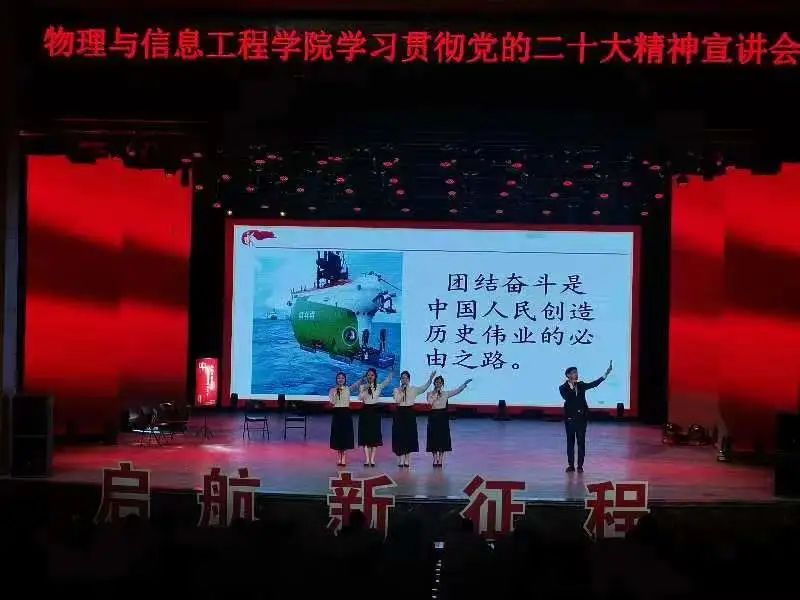 宣讲以“党的二十大精神”为主题,以主题式理论讲解与情景式艺术演绎相结合的方式展开,围绕“高举旗帜,推进伟大复兴”、“伟大实践,中国式现代化”、“青年”三个篇章讲解。通过丰富翔实的数据、生动形象的事例、铿锵有力的话语、激荡人心的舞蹈,讲述了中国共产党如何历经浴血奋斗站起来、砥砺奋进富起来、继往开来强起来。从党的二十大主题和主要成果、过去五年的工作和新时代十年的伟大变革等多个方面作了系统宣讲和深入阐释,用一个个生动的例子阐述共产党人的初心使命、阐述了我们国家在党的领导下发生的变化,引导我们牢固树立听党话、感党恩、跟党走的坚定信念。