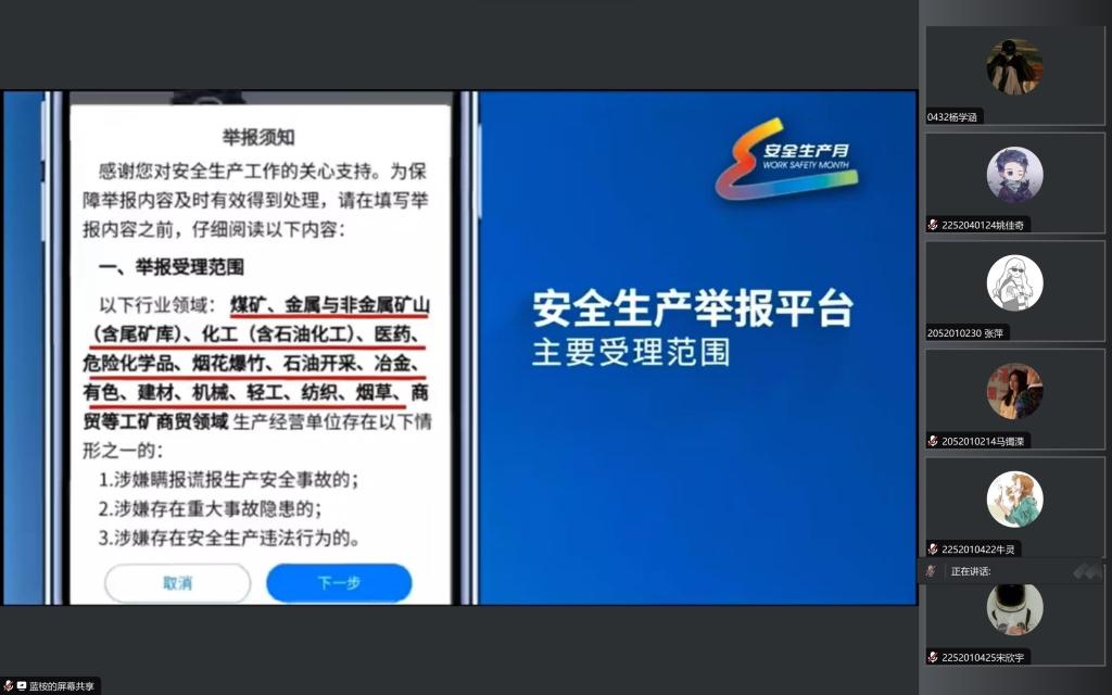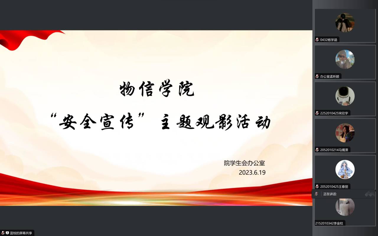 为了加强同学们的安全防范意识,传播安全知识,院学生会办公室于6月19日晚以线上的形式开展了“安全宣传”主题观影活动。部分学生参加了本次活动,本次活动由办公室尚子钧、孟昕颖主持。