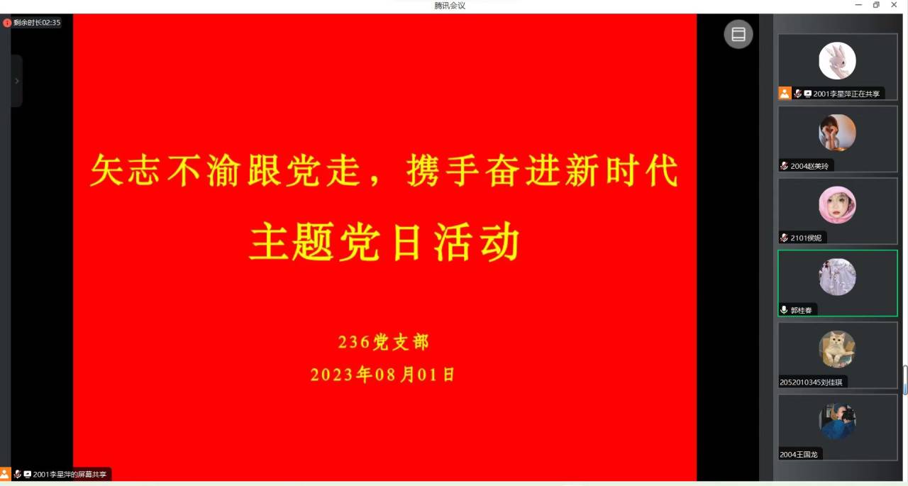 8月1日晚,黄色漫画 236党支部通过腾讯会议召开了“矢志不渝跟党走 携手奋进新时代”线上党日活动。本次活动由支部党员李星萍主持,支部全体党员参加了活动。