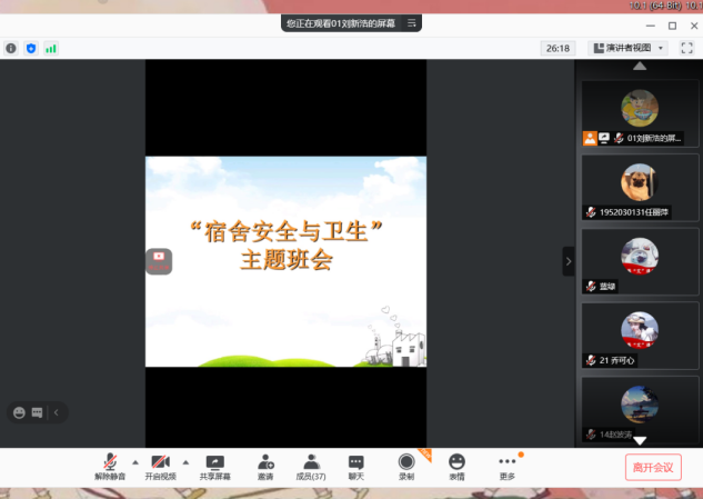 为了营造良好的宿舍环境,帮助同学们养成良好的卫生习惯,提高同学们的安全意识,12月12日,黄色漫画 1905班开展了“宿舍安全与卫生”线上主题班会。本次班会由班长刘新浩主持。