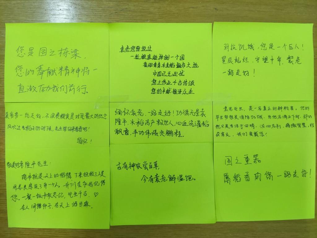 活动中,冀宇琴组织同学们观看了袁老的事迹短片,回顾了袁隆平院士一生所做出的伟大贡献,重温了袁老说过的那些动人的话语,领悟了“杂交水稻之父”身上闪闪发光的品质与精神。随后,同学们围绕袁隆平精神展开了讨论。同学们纷纷表示禾下乘凉梦,一梦逐一生,这是袁隆平的梦,也是每一位中国人的梦,作为青年学生要努力学习袁老以祖国和人民需要为己任,敢于创新、艰苦奋斗的崇高精神。活动结束后,同学们自发写下了对袁老的无限哀思。(文/1902班 徐瑾华 摄/1902班 赵君海)