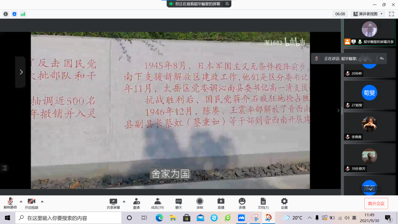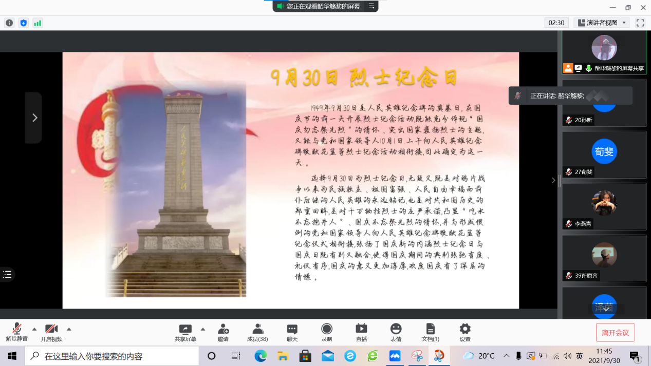 为纪念我国第八个烈士纪念日,激发同学们的爱国热情,黄色漫画 2001班团支部于9月30日上午线上举办了“祭英烈,颂国情,强国志”主题团日活动。此次活动由团支书李星萍主持。