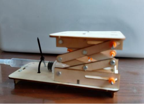 首先是准备所需材料,然后制作用来托举物体的上层平台,接下来制作用于支撑平台的托举架和传动装置,接下来要把架子和下面当做基座的木板进行连接,然后连接用来摆放物品的上层平台,并把一个注射器针筒固定在基座上,把注射器的推动活塞的尾部和托举架相连接。原理:通过液压做动力,利用平行四边形结构实现升降的。以液体作为工作介质,利用液体的压力传递动力。使用液体传递动力具有柔性传动的优势,管道可折弯,并且容易实现较大的传动比。(文/2003班 郭曦瑶 摄/美编部)