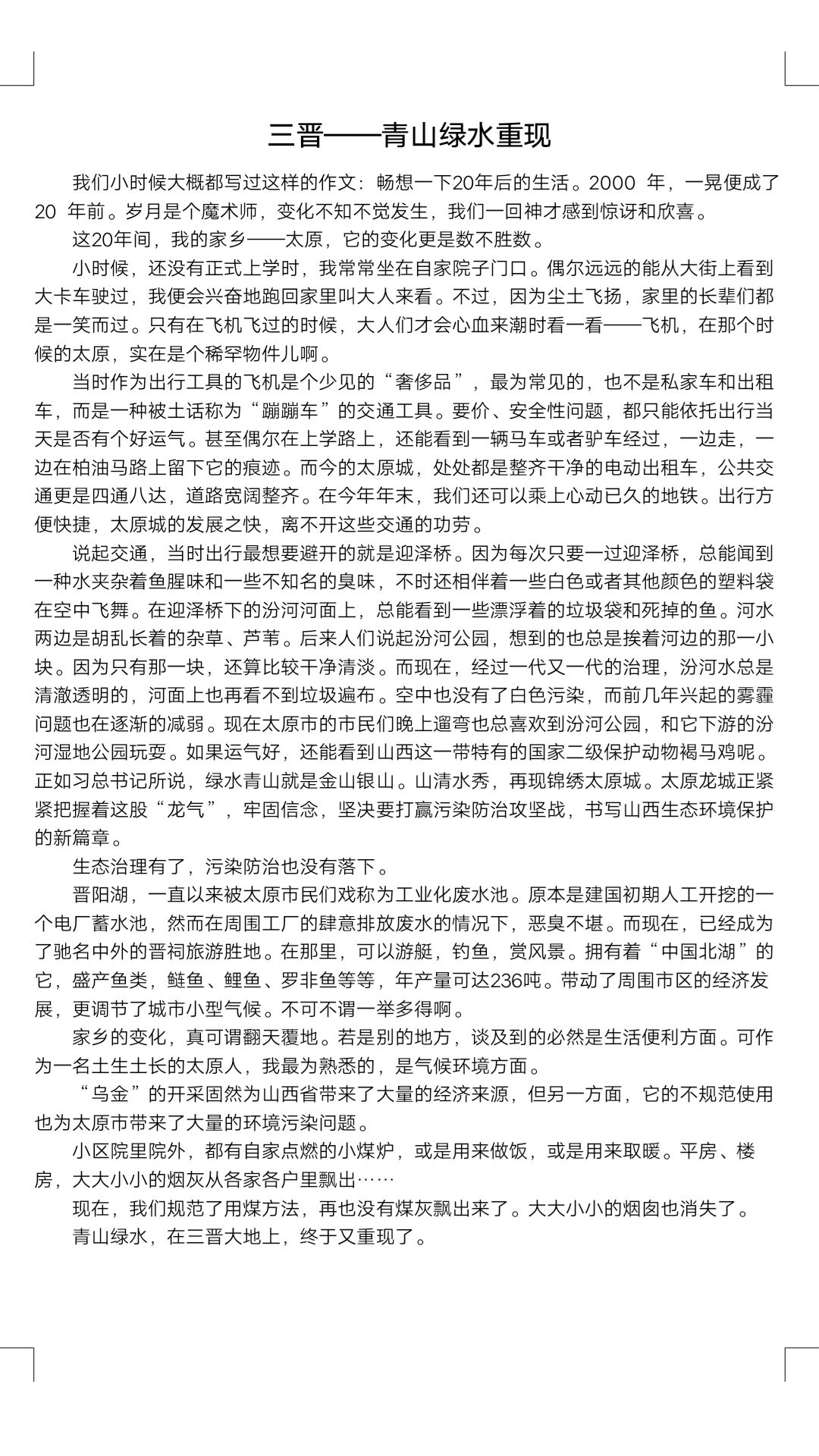 线上的宣传以及丰富多样的创作形式吸引了同学们的关注与参与。线上提交的作品主题鲜明、内容充实、制作精美、生动形象;作品种类也丰富多彩,或写作,或绘画,或视频剪辑。这让我们感受到了来自山西各个地方的同学们各自家乡真实面貌的美好变化,切实感受到了习近平总书记对山西这些年来在脱贫攻坚、生态保护、民生事业等各方面取得成绩的肯定和对山西百尺竿头更进一步的勉励,更看到了同学们立志为家乡,为社会贡献青春与智慧的信心和决心。
