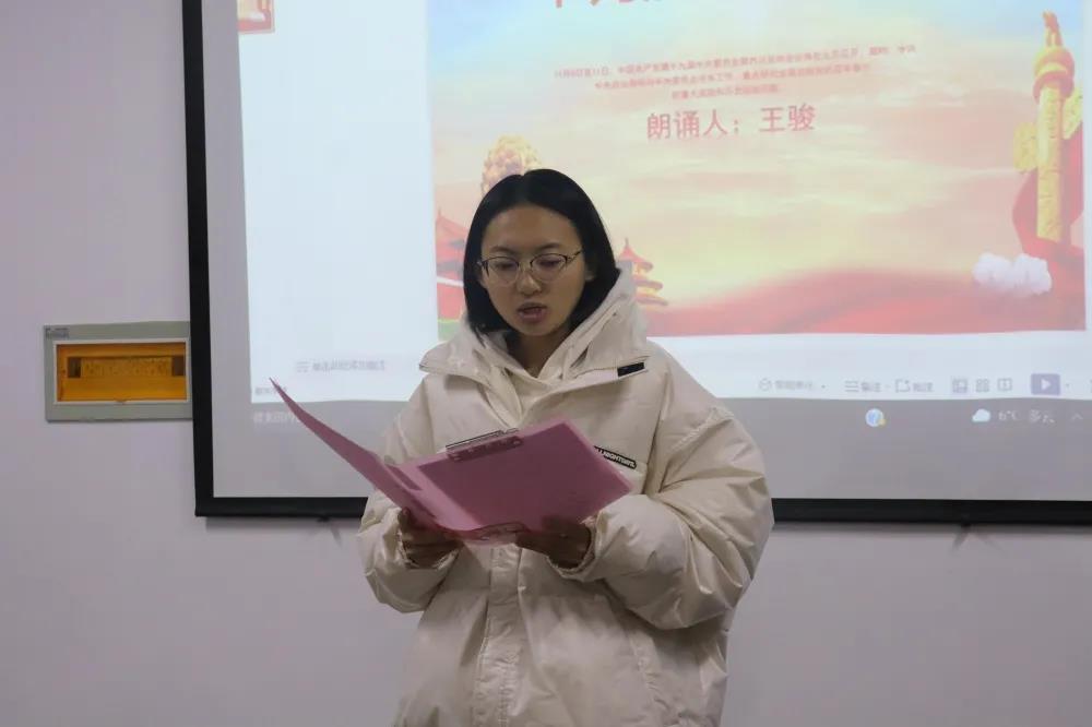 活动中,同学们结合PPT和视频,以“回望百年,奋发今朝”为主题进行朗诵,或回顾百年历史,或展望辉煌未来。在悠扬的配乐与振奋人心的视频背景下,参赛选手以饱满的热情讲述了中国共产党发展历程中的重大事件,生动再现了中国共产党团结带领全国各族人民艰苦奋斗,取得的伟大成就和宝贵经验。朗诵环节结束后,评委对同学们的表现进行了点评。他们在肯定同学们优秀表现的同时也针对比赛过程中暴露的问题提出了三点意见:一是要加强对稿件的熟练度,确保在赛场上的表现流畅自然;二是要充分利用肢体语言,大方得体地表达出自己的情感;三是PPT与背景音乐的选择要恰当,从而起到烘托氛围的效果。