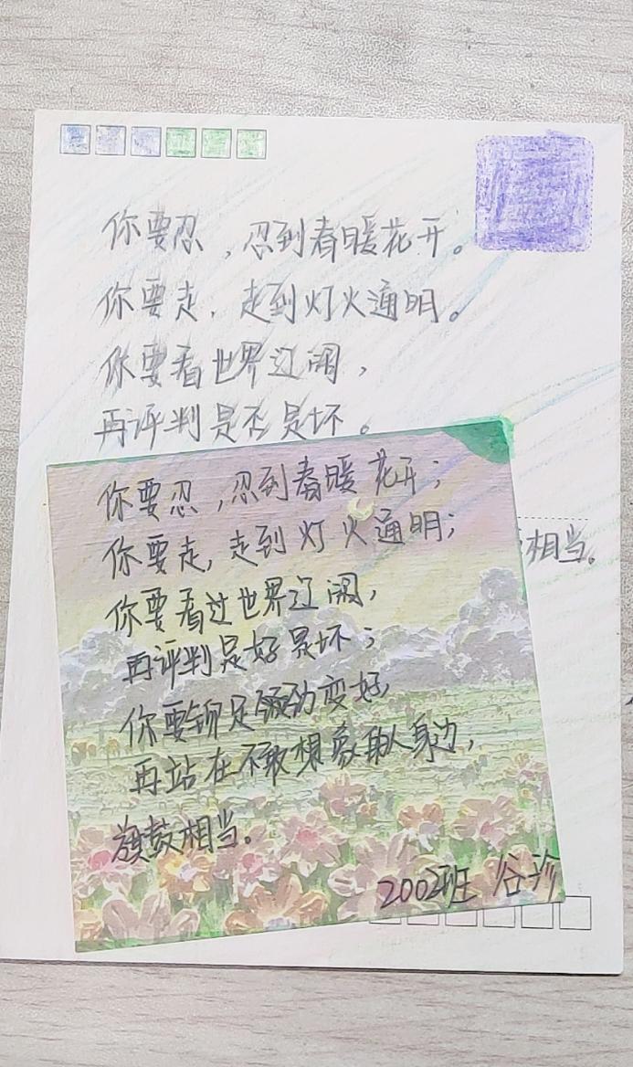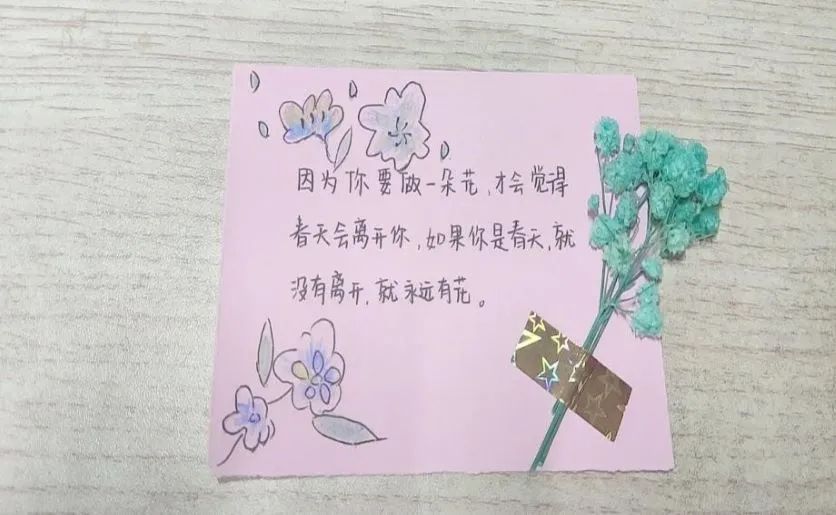 心灵寄语活动。活动中,同学们在自制卡片上写下自己对人生的感悟、体验和感受,通过展览与大家分享,这是给予爱和接收爱的过程。每一个人在爱与被爱中学着敞开心扉,学着传递温暖向上的力量。