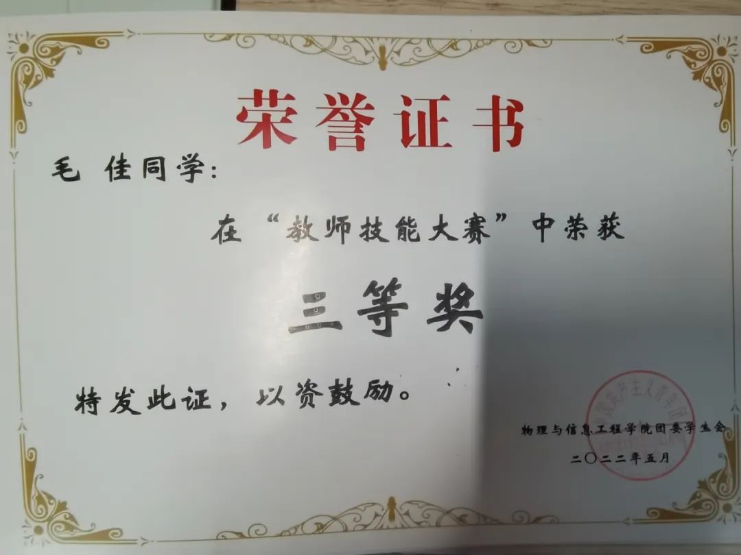 “功不唐捐,玉汝于成”。在青春这条道路上,我们背负着希望,承载着梦想与热爱,勇往直前,最终抵达自己想要的远方。祝愿毛佳学姐秉持初心,不改热爱,也祝愿毛佳学姐的工作一帆风顺,前程似锦。(文/2306班 薛妙青)