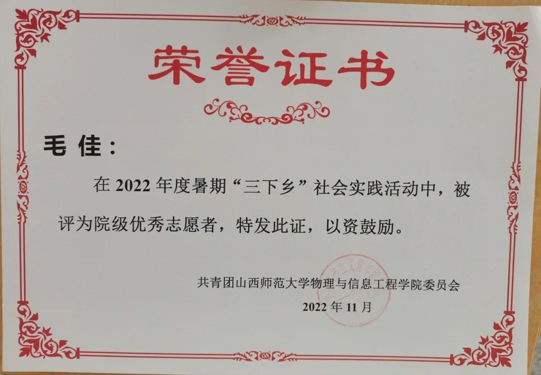 2022学年年度暑期“三下乡”社会实践院级优秀志愿者