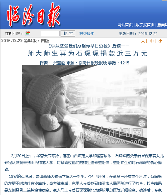 这些爱心善款已分批汇给了石琛琛家人的账户,虽然这与巨额的医疗费用还有一定差距,但相信我们的每一份爱都能给予石琛琛一份希望,一缕阳光。本次爱心活动也得到了社会媒体广泛关注和好评,12月22日《临汾日报晚报》以《师大师生再为石琛琛捐款近三万元》为题(第四版)、11月23日《山西晚报》以《山西师大师生再捐爱心款 重病女生医药费还需20余万》为题(第六版)先后进行了报道。