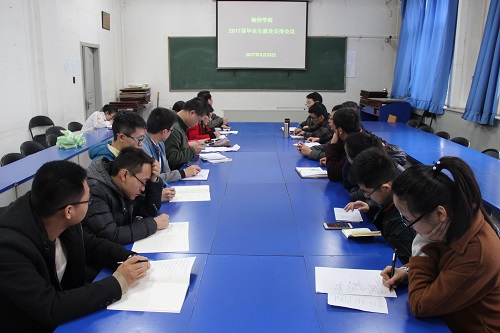 首先,陈向波副书记传达了上午学校2017届毕业生供需见面洽谈会的有关会议精神和要求,着重传达了高书记的讲话精神和要求。他强调全体参会人员要按照学校学院要求,提高认识、高度重视、精心准备,认真做好毕业生供需见面洽谈会的各项准备和服务工作。他着重强调了几个时间节点和几项特殊要求,安排了行政办公室、教学办公室等专人值班,团委学生会要积极配合学院和毕业班,为毕业生就业提供及时有效的相关服务。要求辅导员和各班加强对毕业生择业观和就业技能的教育,毕业生要树立正确的择业观,摆正心态,轻松应聘。同时要提高警惕、防止在就业中遭受到不必要的损失。毕业生要响应党和政府的号召,到基层去、到精准扶贫的地方去,到祖国和人民最需要的岗位上去。毕业班的学生党员和学生骨干,要严格按照“两学一做”的要求,发挥好先锋模范作用和带头作用,为班内同学参加供需见面会提供最大最好的帮助。