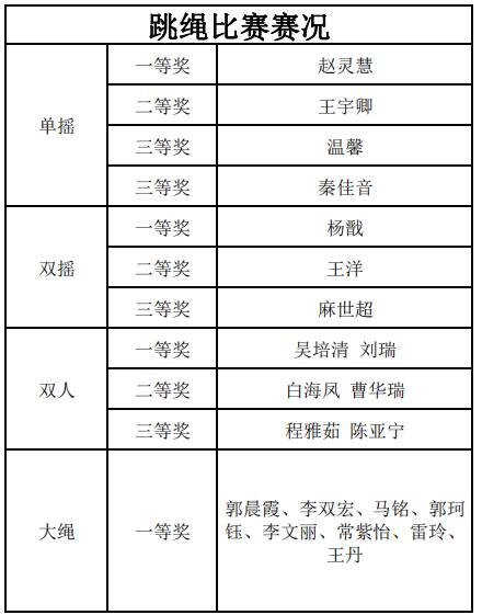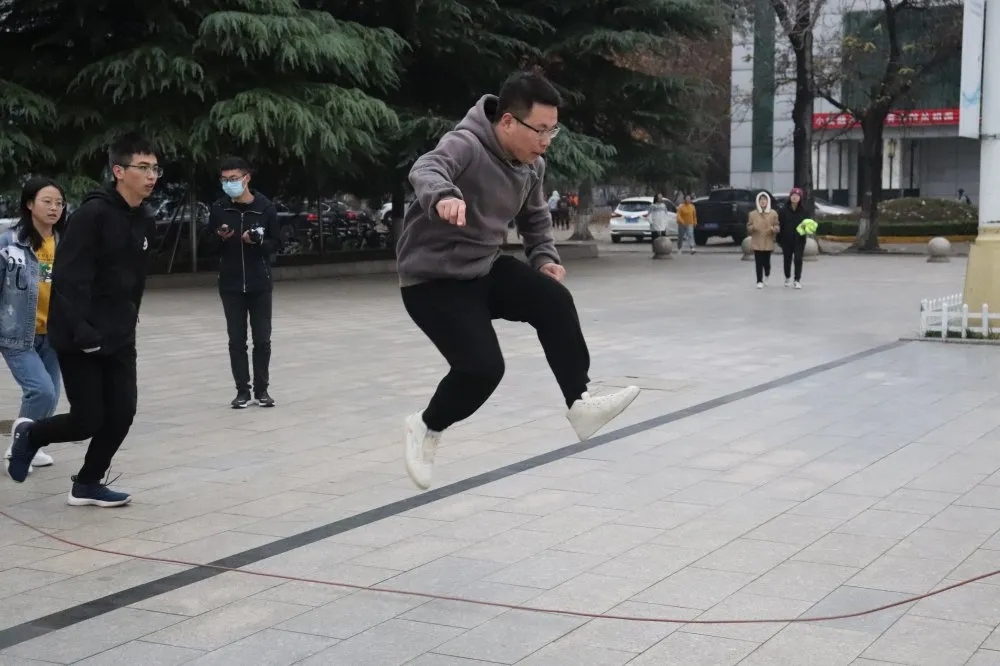 此次比赛分为单人项目、双人项目以及“三分钟长绳跳”集体项目。严寒的天气并没有阻挡同学们的热情,选手们拼尽全力跳动,发挥出自己的最佳水平。多人项目中,同学们充分发挥团队精神,通力协作,默契配合,比赛现场紧张激烈又不失趣味。