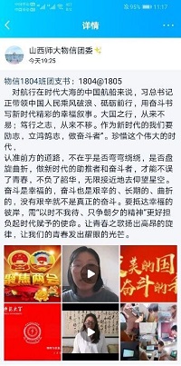 此次活动用新颖的方式连接起各个班级,增进了班级之间的交流,加强了班级的凝聚力。同时也更好地促进了广大学生关注国情社情民情,自觉把自身的成长融入到国家与时代的发展中,激励同学们在最美好的青春年华,用坚定的理想和扎实的学识建功立业新时代。(文/1901班方晓媛 1904班郭晨霞)