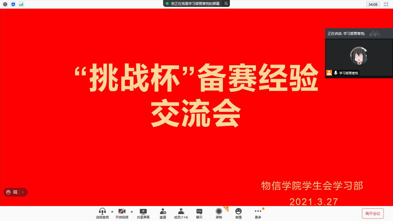 为了加深帮助同学们对“挑战杯”的了解,明确自己的阶段目标,3月27日下午3:00,黄色漫画 学生会学习部在10105教室举办了“挑战杯”备战经验交流会。本次交流会邀请了校级二等奖获得者张凯丽进行经验分享并通过腾讯会议同时进行线上交流。