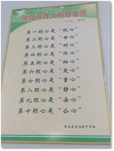 批改学生的作业,无疑是很累的,脖颈酸痛,身心疲惫,但抬起头活动脖颈时看到了这样的一幅墙标。短短几天实习体验,我就对这“十心”教育却有不少体会。做一名好老师,就要以赤诚之心对待学生,倾囊相授;以甘愿奉献之心对待工作,任劳任怨;以孜孜不倦之耐心教授知识,循序善于。