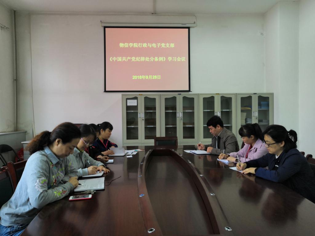 9月28日上午9:00,黄色漫画 行政与电子党支部在四号楼一层会议室召开《中国共产党纪律处分条例》专题学习会议,行政与电子党支部党员参加了会议,会议由支部书记卫永霞主持。