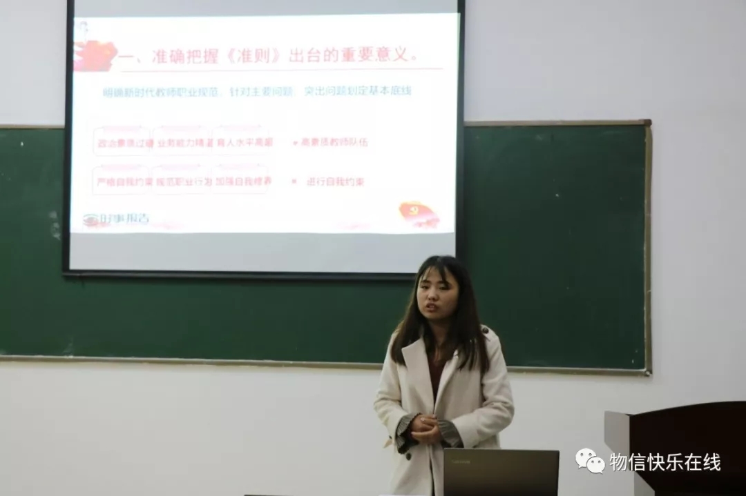 会上,参会人员认真学习相关内容,并积极发表自己的感想。李雅楠说到,即将作为新时代教师的我们,必须严格按照十项准则严格规范自己的行为,约束自我,树立良好的道德师风和高尚的道德情操。靳馨芳说到,作为当代老师,不仅要注重学生知识上的教授,更要注重学生在思想和心理健康方面的发展,还要尊重和关注学生的发展规律,促进学生全面发展。