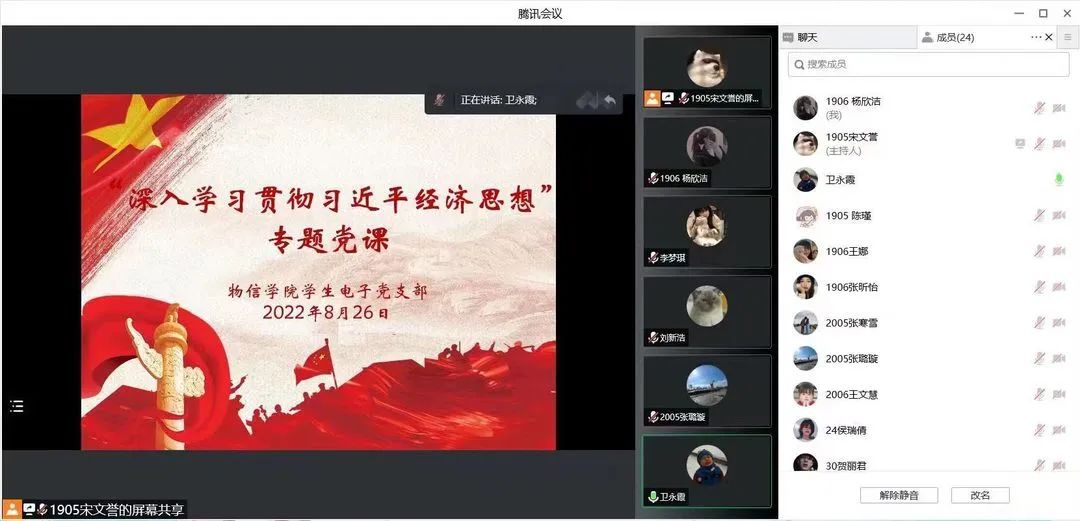 8月26日晚上7:00,黄色漫画 学生电子党支部线上开展了“深入学习贯彻习近平经济思想”专题党课。本次党课由支部书记卫永霞讲授,支部全体党员参加了活动。