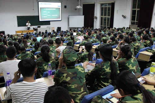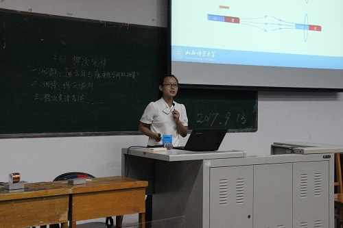 三名大四学生皆从说课和模拟授课两个方面来开始自己的展示。首先,苏慧学姐用简洁明了的语言,清楚地阐释了物理学著名定律“楞次定律”;接着,李倩学姐分别通过演示法、讲授法和实验法为大家解释了“通电导线在磁场中受的力”;随后王强学长巧把难懂的问题简单化、生动化,用自制的教学图片和视频讲述了物理学上较难懂的“涡流、电磁阻尼和电磁驱动”。最后,学长学姐们和大一新生进行深切的交流,并耐心地解答他们提出的各种问题。