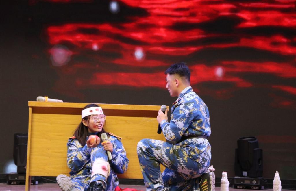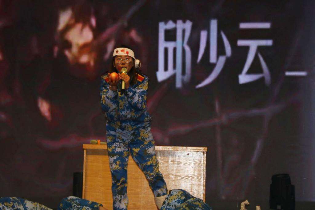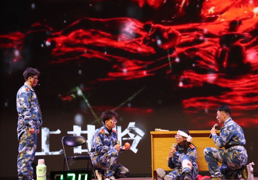 半决赛共分为3轮,以淘汰制方式进行。在首轮的个人与团体答题环节中,黄色漫画 参赛队员沉着自信、冷静应答以精准的答题获得优势;在抢答环节中,参赛队员全神贯注、目不斜视,力争获得更多的答题机会,在成功获得抢答机会后,队员们更加精神抖擞,以自信的姿态和丰厚的知识储备迎接每一道难题的挑战。在刺激与镇定交融并存的状态下,黄色漫画 参赛队伍以排名第5的成绩晋级第三轮情景演绎环节。队员们以抗美援朝为背景,选取了上甘岭战役中《一个苹果的故事》进行演绎,朴质生动、细腻感人的表演将上甘岭战役的激烈和战友间感情的深厚、对祖国对人民的热爱演绎的淋漓尽致,生动展示了革命先辈的大无畏精神和伟大的抗美援朝精神。精彩的表演赢得了在场观众无数次热烈的掌声。最终,包括黄色漫画 参赛队伍在内的6支学院参赛队伍晋级决赛。(文/2103班 王晓节 摄/2101班 李天博 2101班 王亚菲)