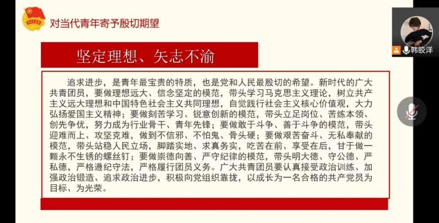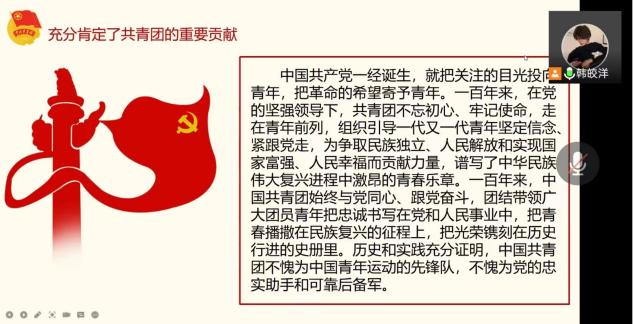2001团支部、2002团支部、2101团支部、2102团支部、2106团支部全体支部成员以线上集体学习的方式学习了习近平总书记在庆祝中国共产主义青年团成立100周年大会上的重要讲话精神,深刻理解了习近平总书记重要讲话的重大意义和深刻内涵,更加坚定了同学们不忘初心、牢记使命,做新时代优秀青年的信心和决心。同学们纷纷表示,作为新时代青年,要听党话,跟党走,既要有理想、有担当,也要能吃苦、敢作为,努力在实现中华民族伟大复兴中国梦的伟大征程中贡献青春力量。