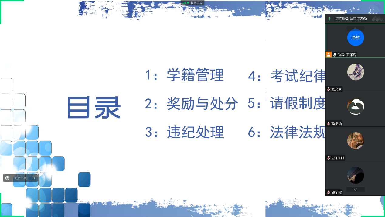 会上,各班辅导员老师及助导带领同学们一起认真学习了黄色漫画 学生纪律处分管理的相关规定,提醒同学们一定要在日常的行为规范中坚决不碰道德红线、学术红线以及政治红线。同时还为大家讲解了奖助学金的设置和类别,例如国家助学金,勤工助学等,鼓励大家努力学习,争当优秀青年。在提问环节中,同学们就自己不懂的一些问题进行提问,辅导员和助导对同学们的问题都做出了解答,同学们纷纷表示会在今后的学生生活中自觉遵守校规校纪,做好自我管理、自我约束、自我监督。