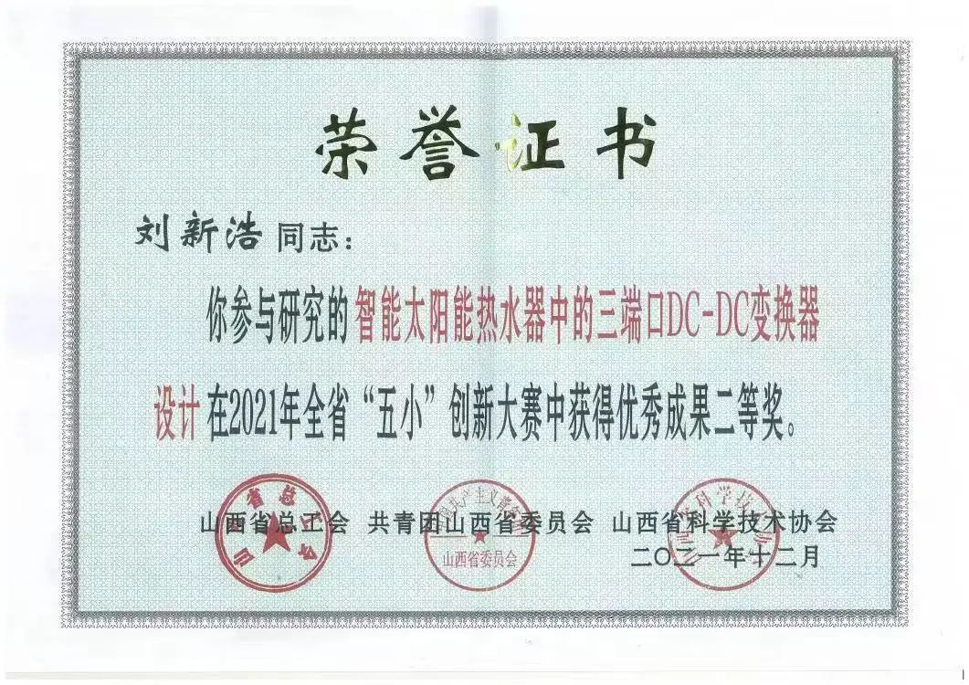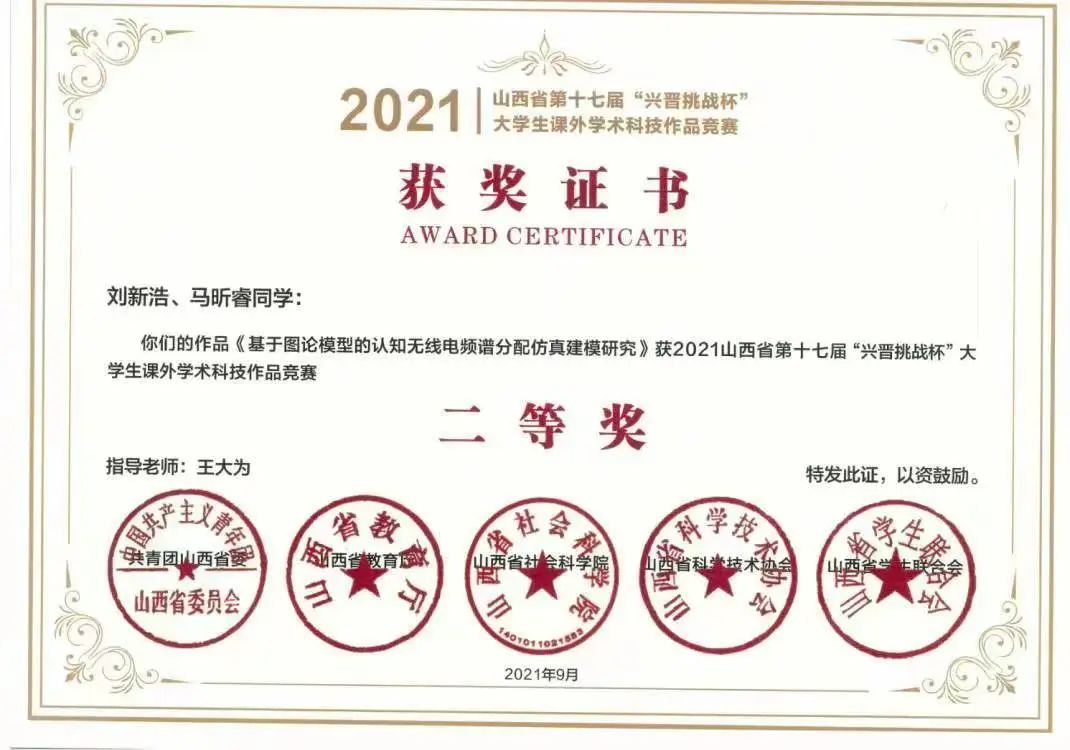 2021年山西省第十七届“兴晋挑战杯”全国大学生课外学术科技作品竞赛(队长) 省二等奖