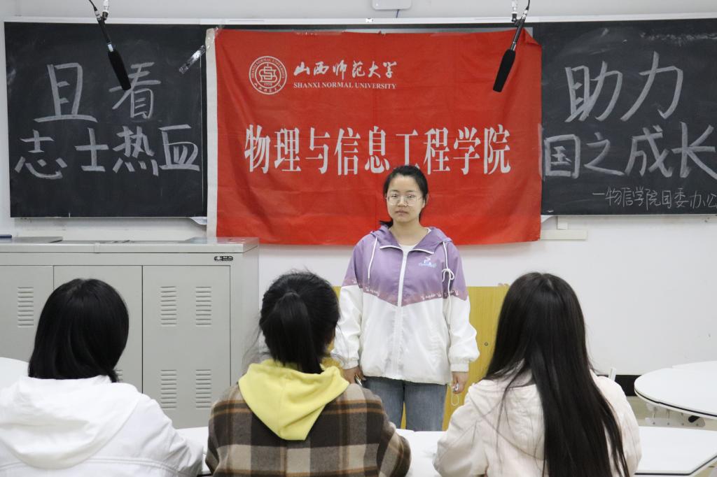 为弘扬光荣传统,赓续红色血脉,展示同学们团结创新、锐意进取、蓬勃向上的精神风貌,4月22日晚,院学生会团委办公室在5104开展“且看志士热血,助力国之成长”舞台剧演员选拔赛。本次活动由团委办公室赵廷怡主持。