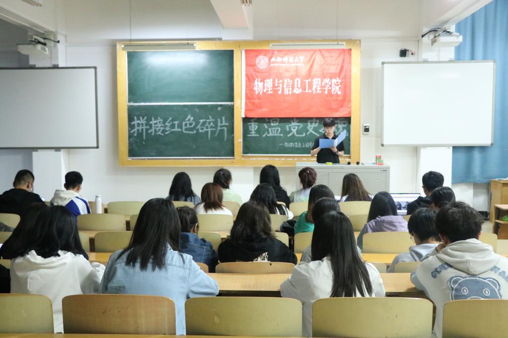为加强对学生的爱国主义教育,促进同学们对党的光荣历史和丰功伟绩的了解,树立爱国主义情怀,5月3日晚,院团委办公室在南区五号楼5108教室举行“拼接红色碎片,重温党史之魂”主题活动。本次活动由团委办公室袁凡主持。