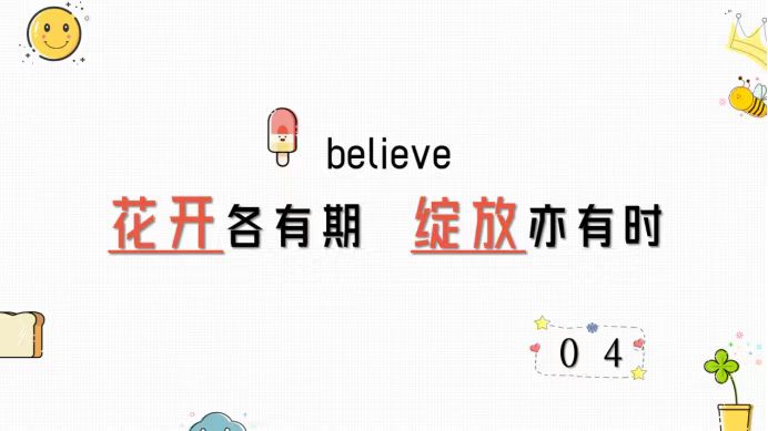要相信“花开各有期,绽放亦有时。”你不需要看到当下别人学业或是工作顺利拿到成果了,就慌乱了自己的阵脚和节奏,开始怀疑自己失去信心,放下了自己手中本应该坚持的事情。