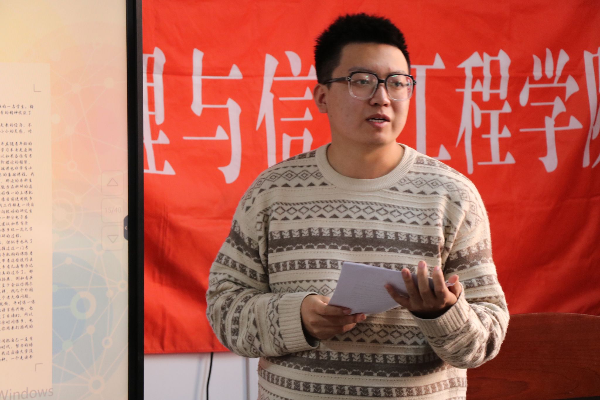 会上,20级、21级、22级各班以PPT展示和班级负责人讲解相结合的方式对上一学年班级在思想文化建设、班风学风建设、文体活动开展和班级所获荣誉等方面的做法和成果进行了汇报交流,对各项工作作出总结和反思,同时还对本学年的工作进行了展望。会议最后,曾荣获校级先进班集体、校级先进团支部的2004班班长王泽辉就如何开展班级工作从思想建设、组织建设、学风建设、文化建设等方面进行了经验分享与总结,同时也分享自己担任4年班长的心路历程,希望同学们珍惜身为学生干部的时光,因为每段经历都是成长。