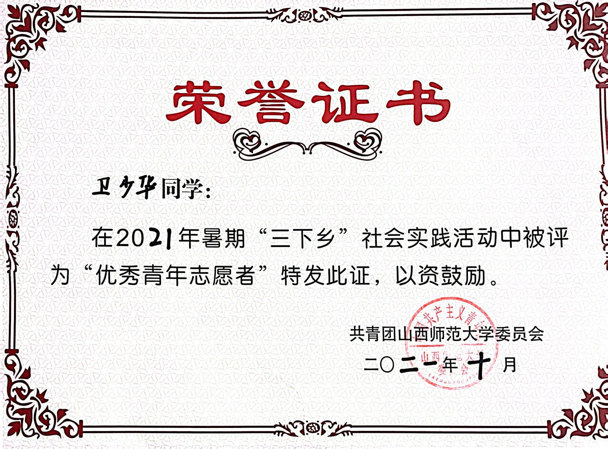 2020年10月 校级暑期“三下乡”优秀青年志愿者