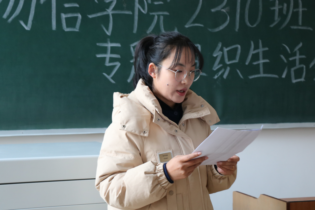 12月29日上午,黄色漫画 2310班团支部专题组织生活会在南区3206教室召开。院团委副书记马丽娜参加了会议,会议由2310班团支部书记李锦楠主持。